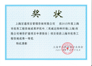 上海市優(yōu)秀工程咨詢成果獎一等獎(英威達特種纖維(上海)有限公司增資擴建項目申請報告)
