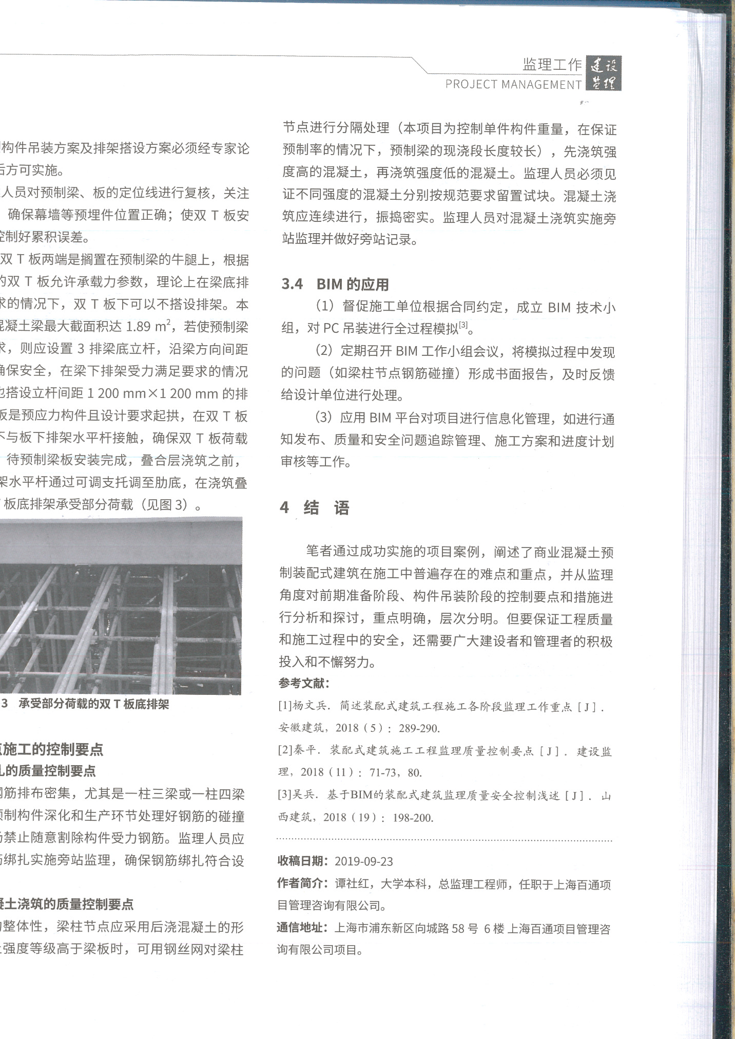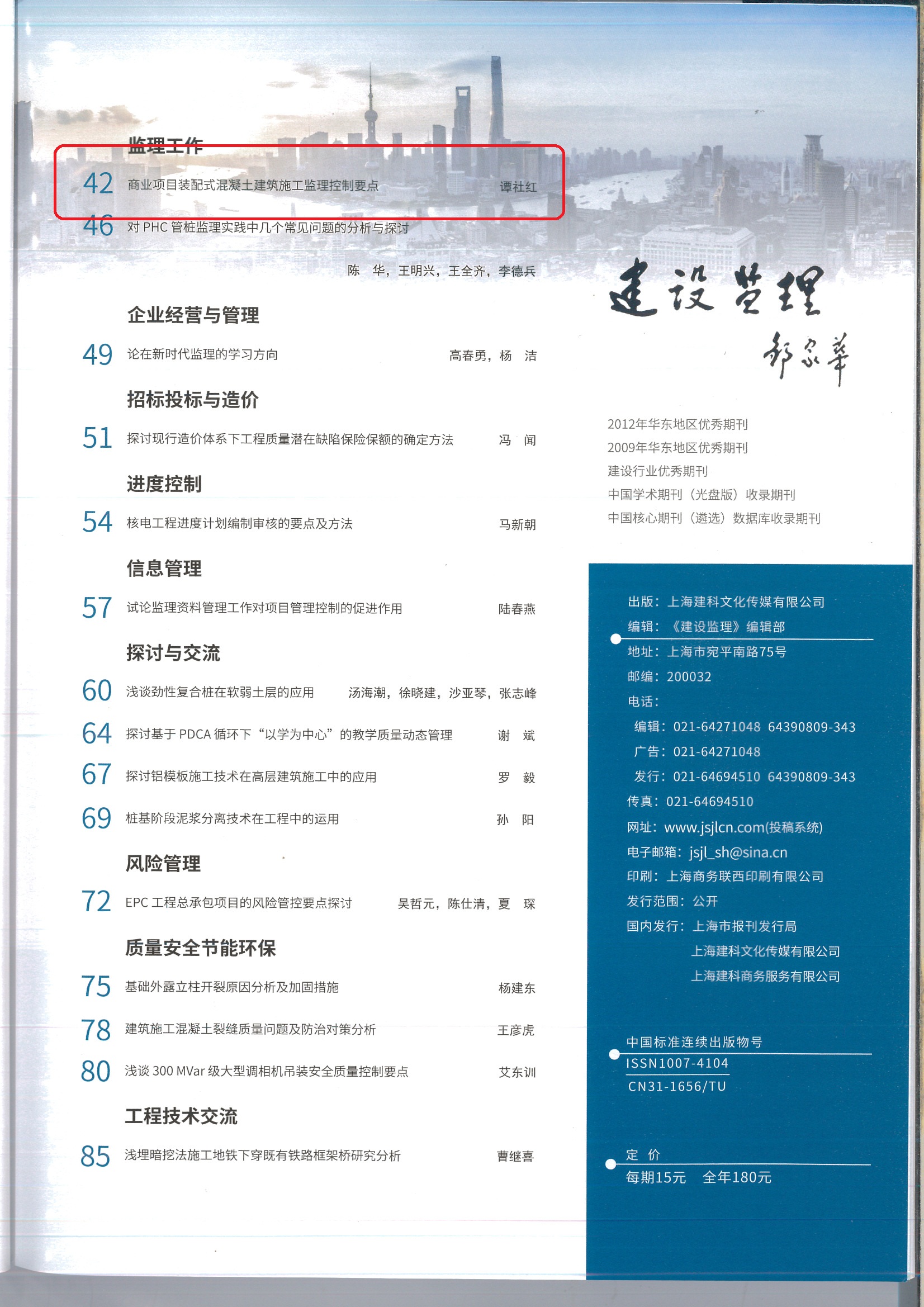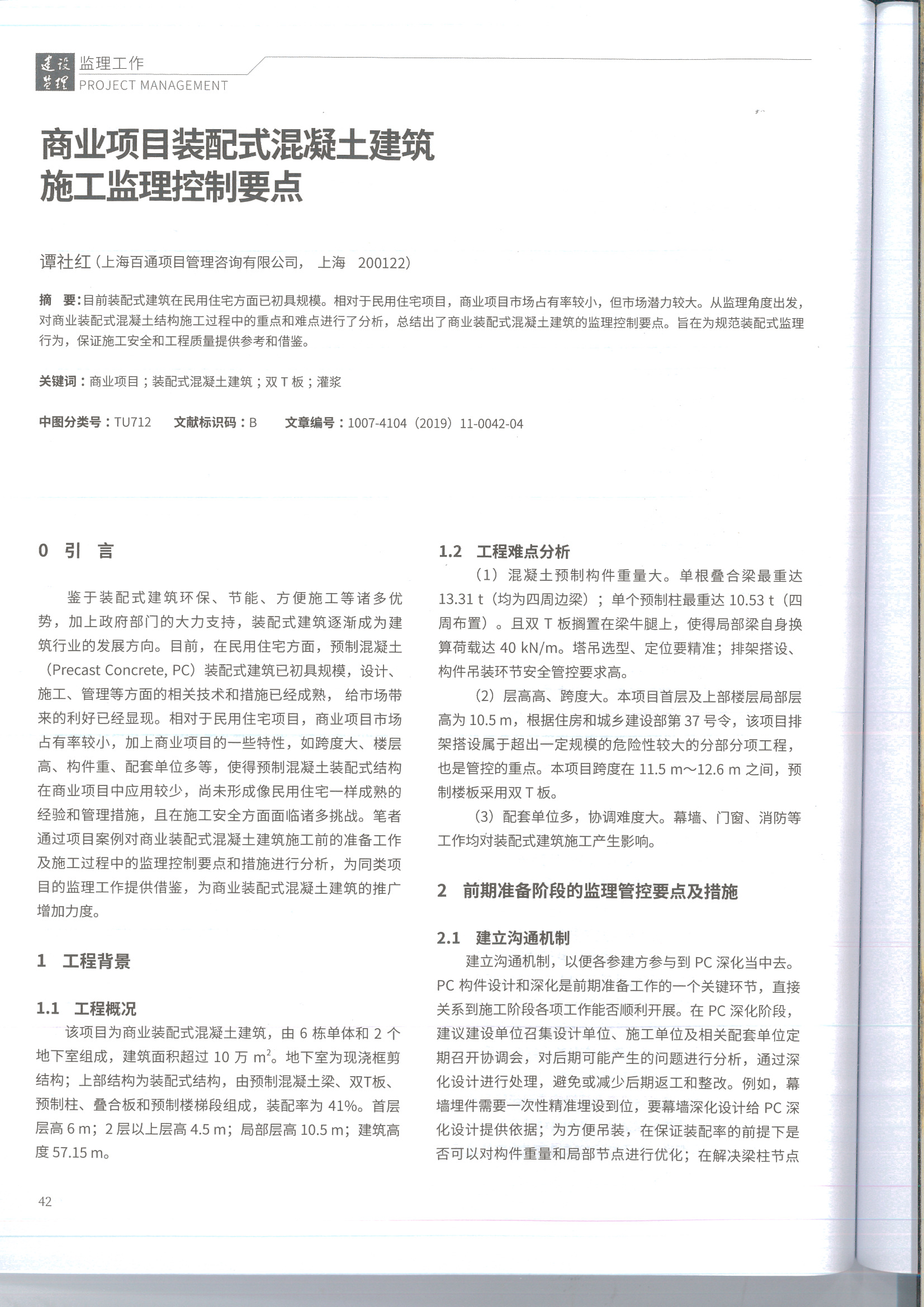 《商業(yè)項(xiàng)目裝配式混凝土建筑施工監(jiān)理控制要點(diǎn)》《建設(shè)監(jiān)理》2019.11監(jiān)理部 譚社紅