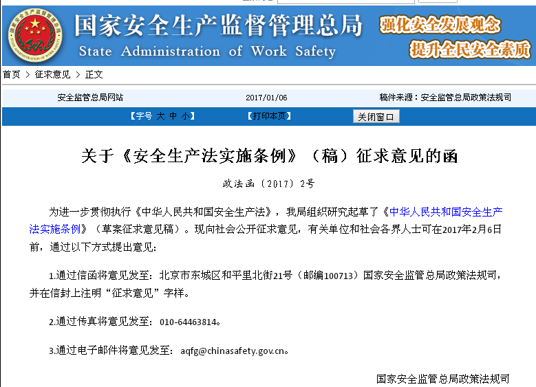 | [安監(jiān)總局]關于《安全生產法實施條例》(稿)征求意見的函【政法函[2017] 2 號】 |