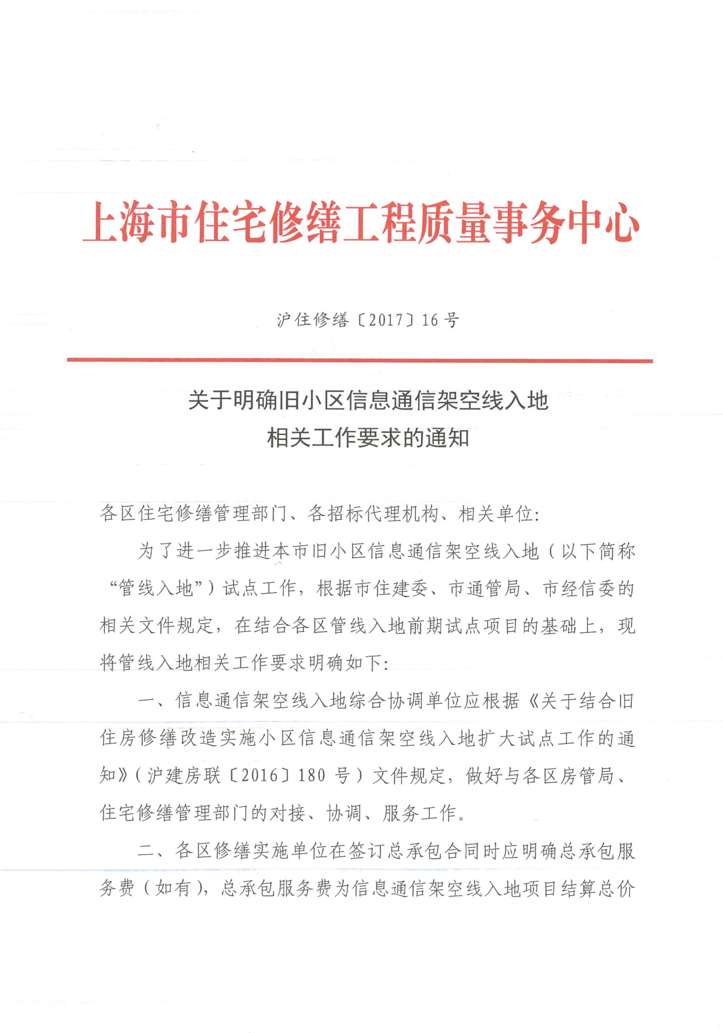 關(guān)于明確舊小區(qū)信息通信架空線入地相關(guān)工作要求的通知 (滬住修繕[2017]16號(hào))