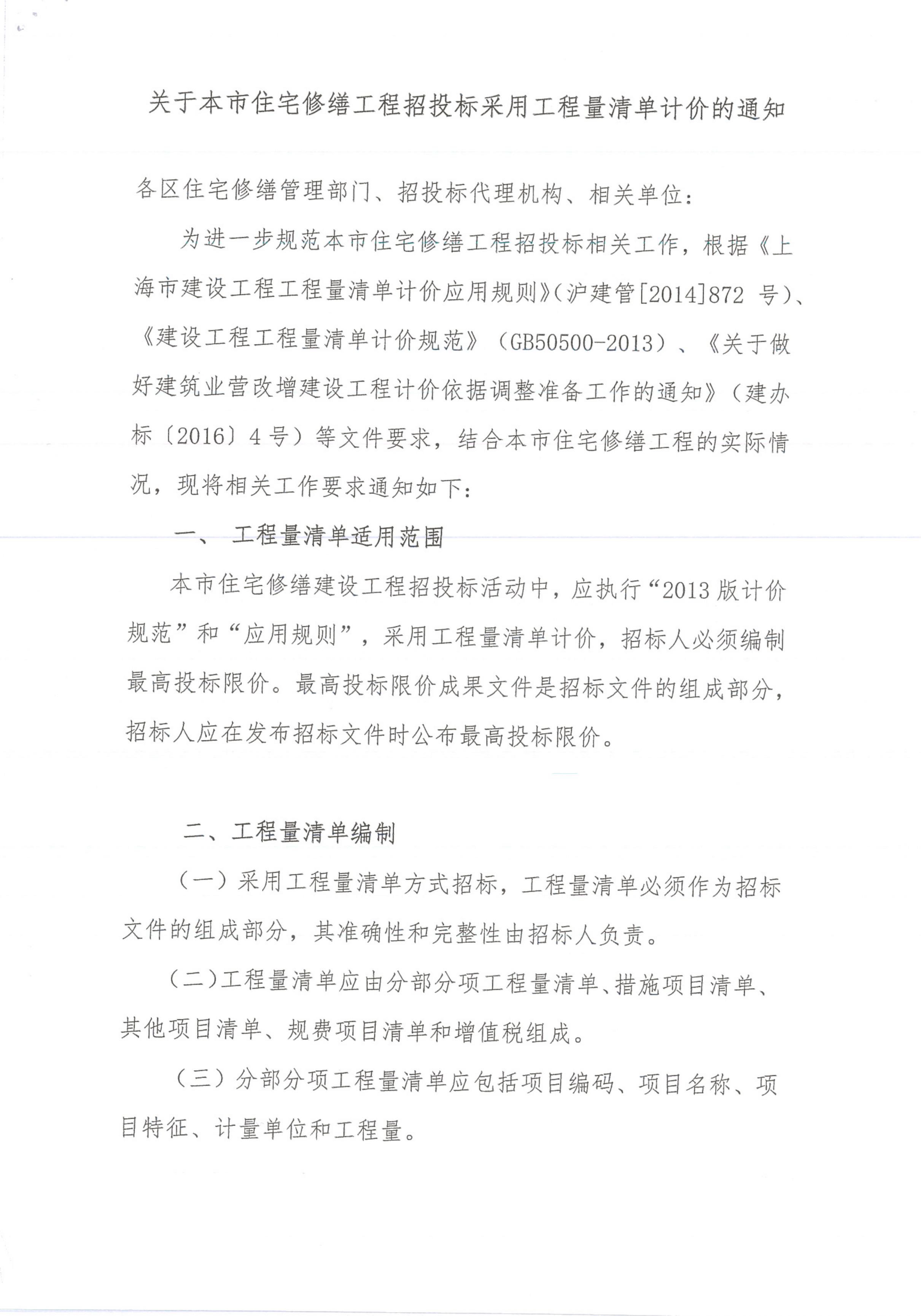 關(guān)于本市住宅修繕工程招標(biāo)采用工程量清單計(jì)價(jià)的通知
