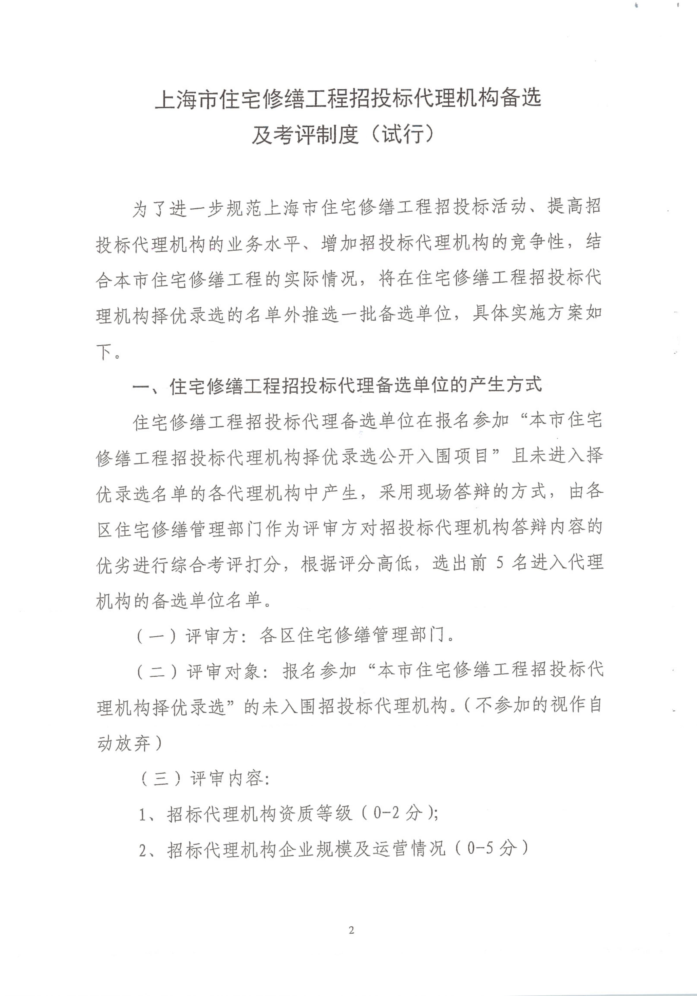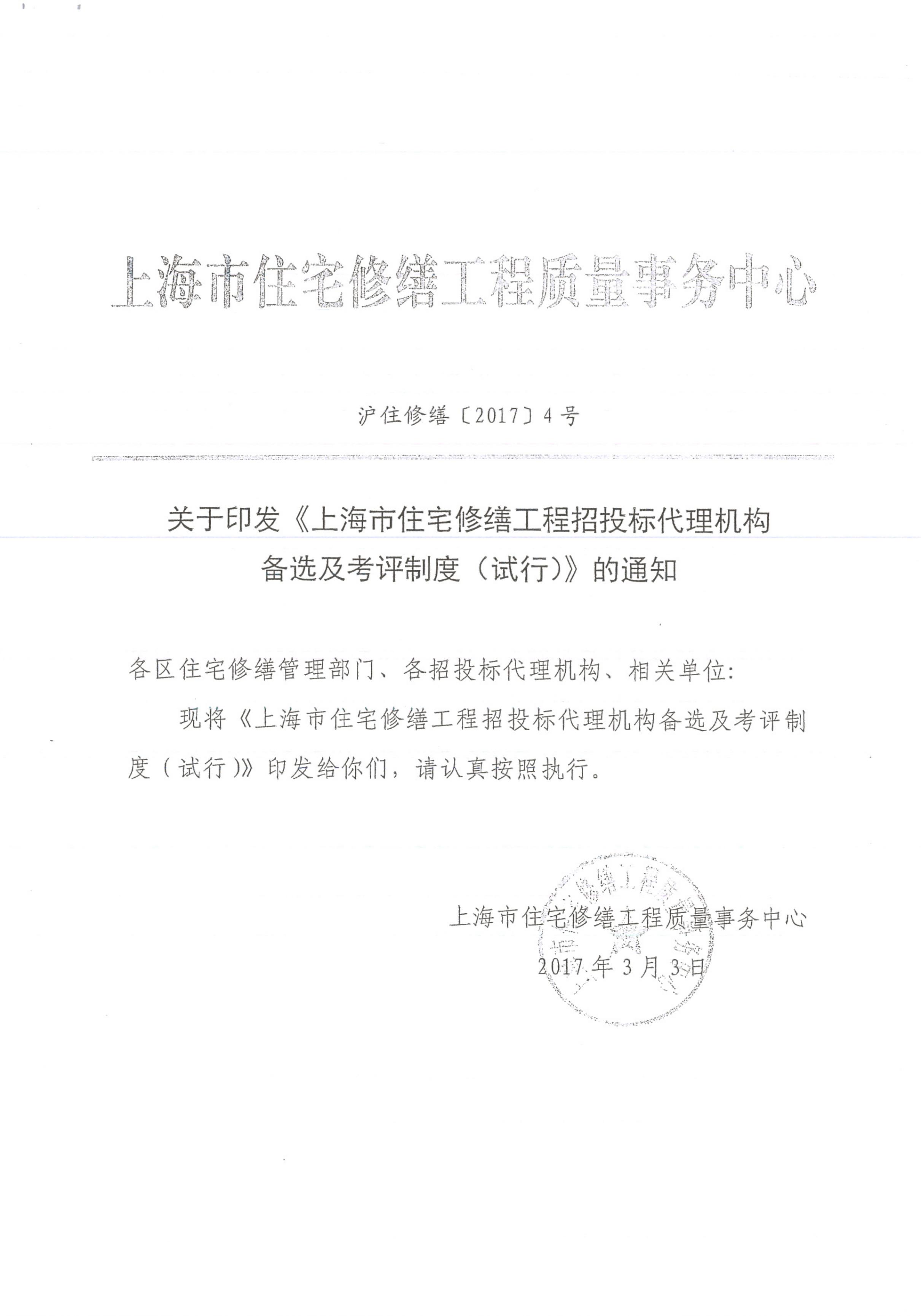 關(guān)于引發(fā)《上海市住宅修繕工程招投標(biāo)代理機(jī)構(gòu)備選及考評制度(試行)》的通知(滬住修繕[2017]4號)