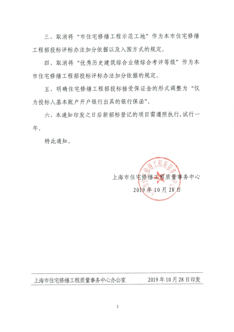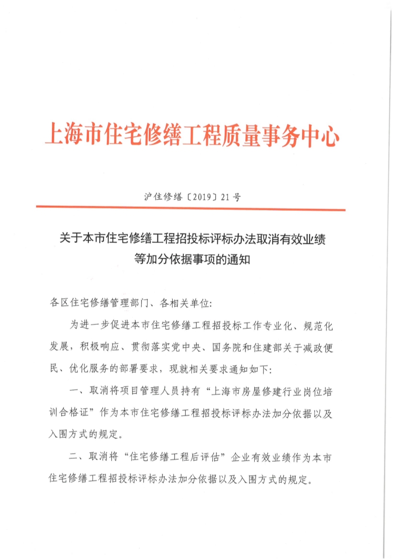 關(guān)于本市住宅修繕工程招投標評標辦法取消有效業(yè)績等加分依據(jù)事項的通知 滬住修繕[2019]21號