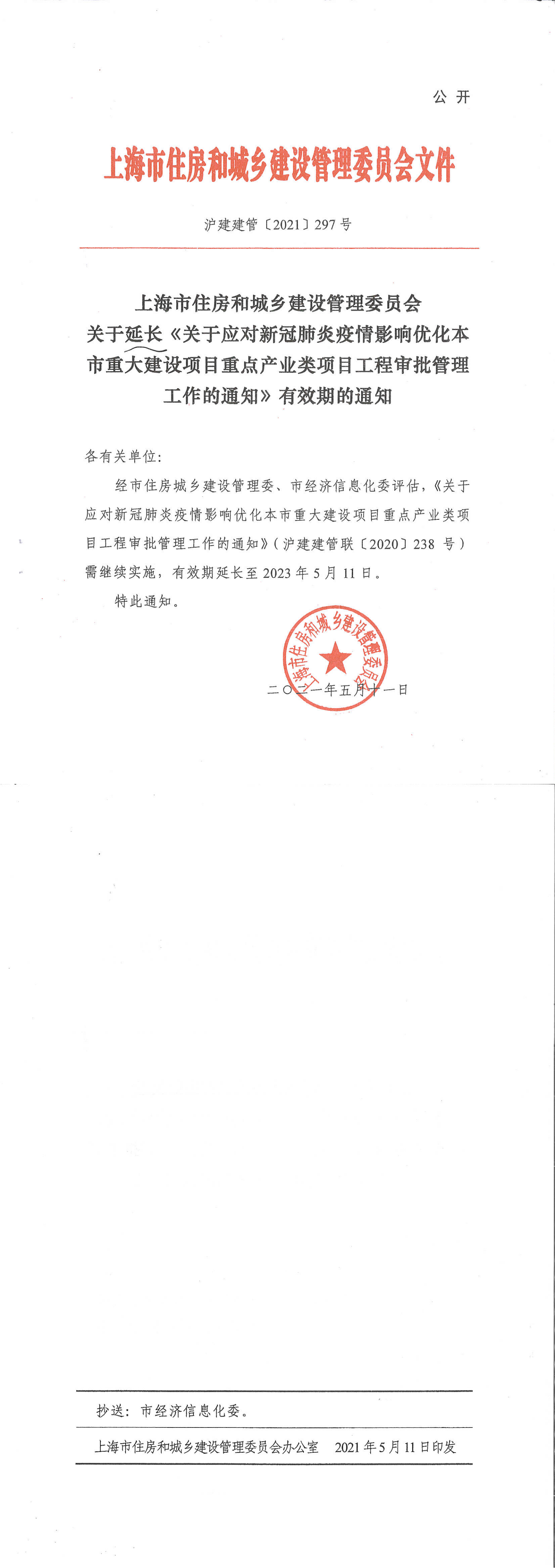 關(guān)于延長《關(guān)于應(yīng)對(duì)新冠肺炎疫情影響優(yōu)化本市中大建設(shè)項(xiàng)目重點(diǎn)產(chǎn)業(yè)類項(xiàng)目工程審批管理工作的通知》有效期的通知(滬建建管[2021]297號(hào))