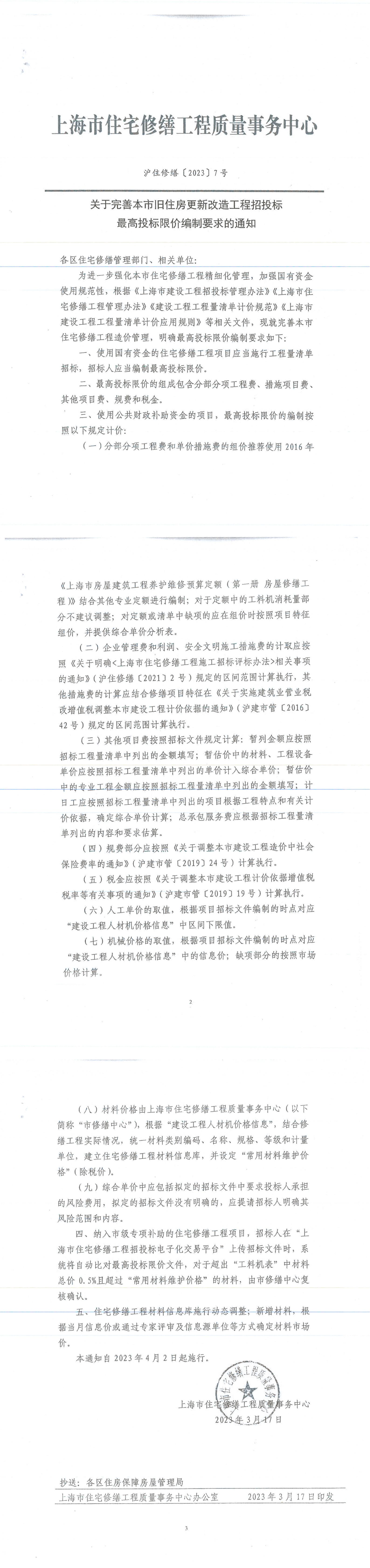 關(guān)于完善本市舊住房更新改造工程招投標(biāo)最高投標(biāo)限價(jià)編制要求的通知【滬住修繕〔2023〕7 號(hào)】