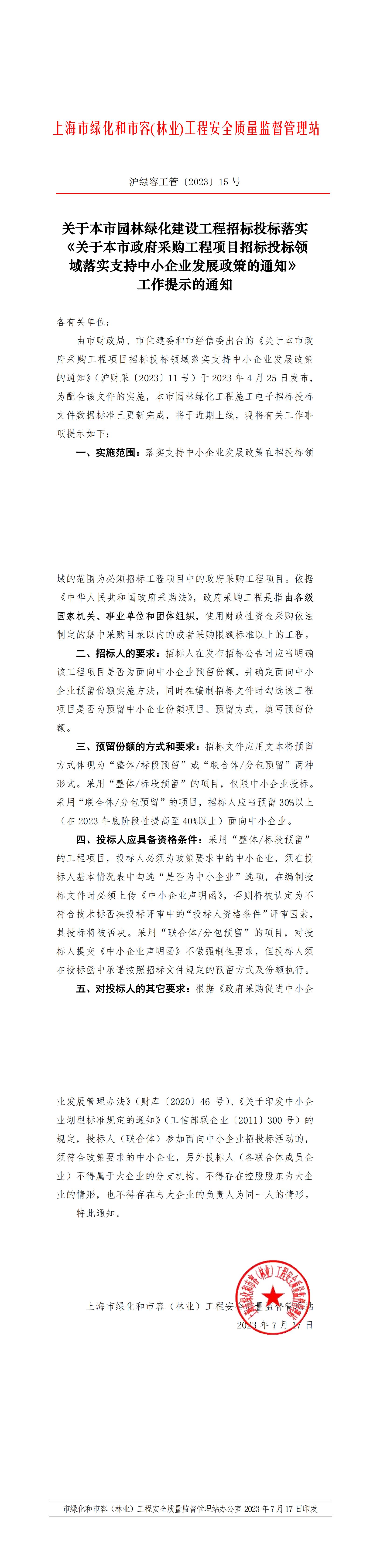 關(guān)于本市園林綠化建設(shè)工程招標(biāo)投標(biāo)落實(shí)《關(guān)于本市政府采購(gòu)工程項(xiàng)目招標(biāo)投標(biāo)領(lǐng)域落實(shí)支持中小企業(yè)發(fā)展政策的通知》工作提示的通知【滬綠容工管〔2023〕15 號(hào)】