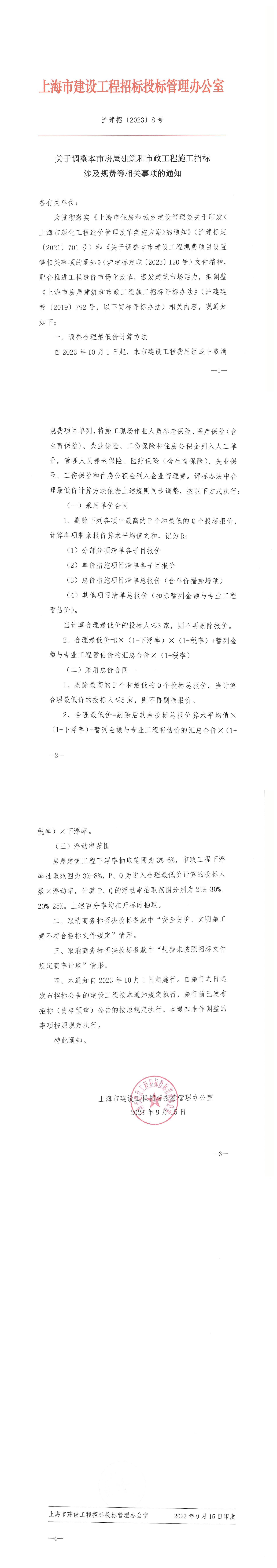 關(guān)于調(diào)整本市房屋建筑和市政工程施工招標(biāo)涉及規(guī)費(fèi)等相關(guān)事項(xiàng)的通知【滬建招〔2023〕8號(hào)】