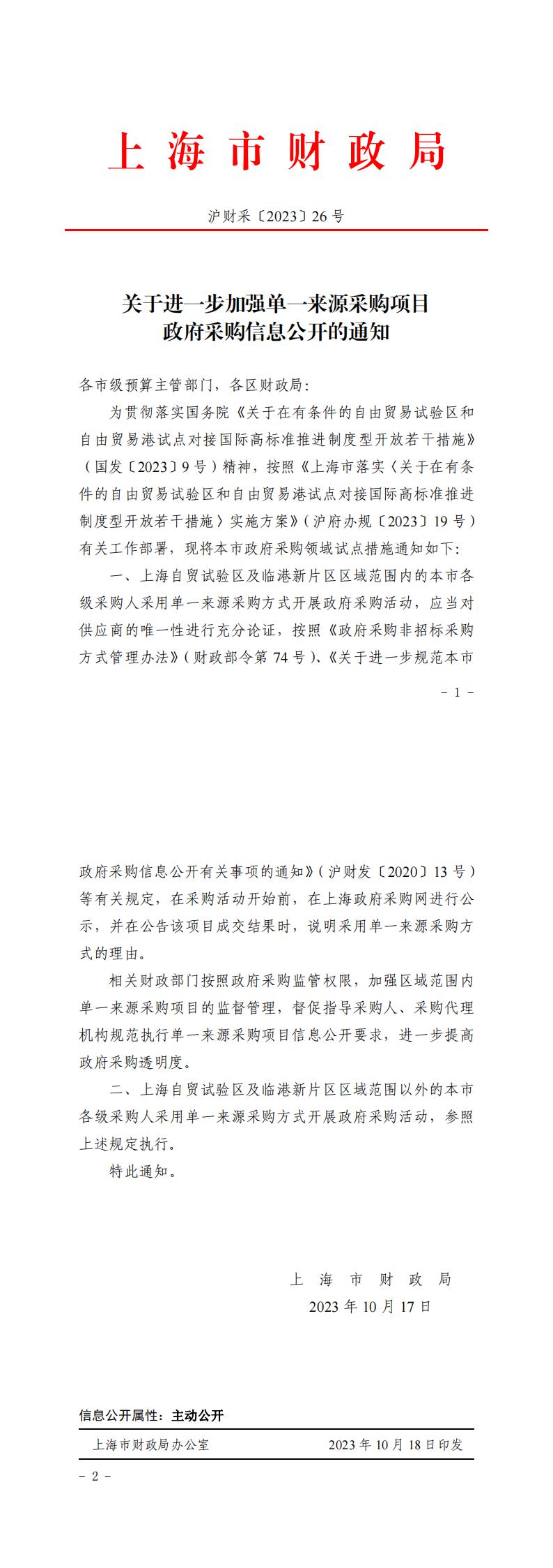 [市財政局]關(guān)于進(jìn)一步加強單一來源采購項目政府采購信息公開的通知【滬財采〔2023〕26 號】