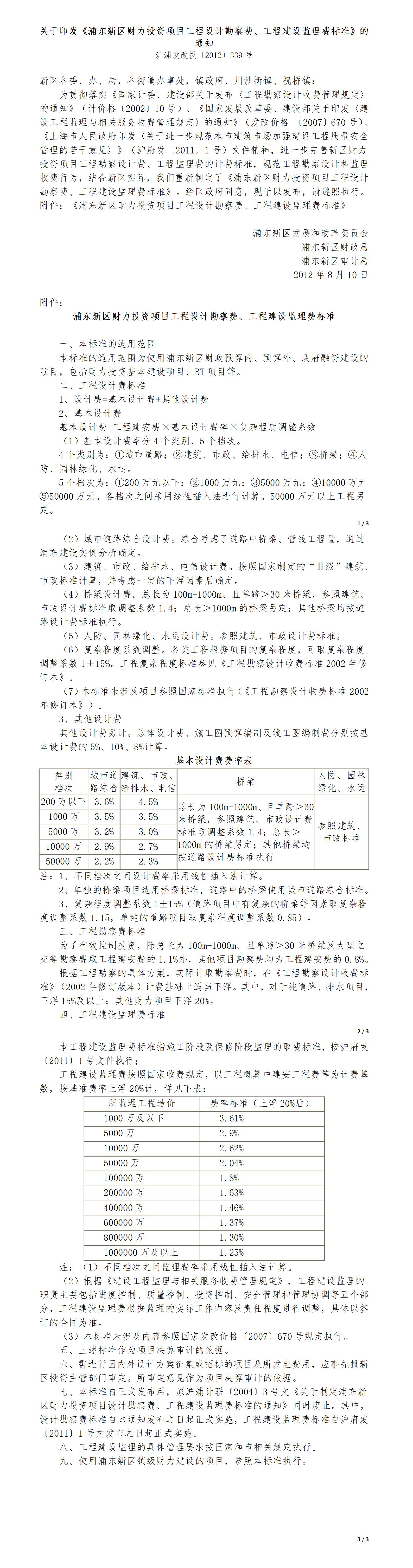 關(guān)于印發(fā)《浦東新區(qū)財(cái)力投資項(xiàng)目工程設(shè)計(jì)勘察費(fèi)、工程建設(shè)監(jiān)理費(fèi)標(biāo)準(zhǔn)》的通知【滬浦發(fā)改投〔2012〕339號】
