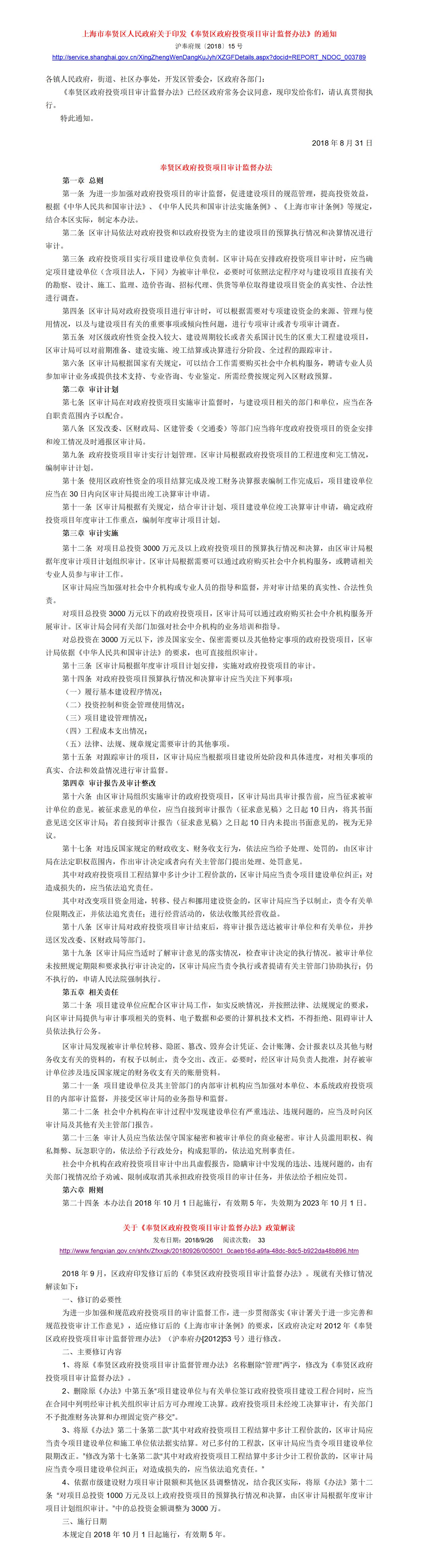 [奉賢]關(guān)于印發(fā)《奉賢區(qū)政府投資項目審計監(jiān)督辦法》的通知【滬奉府規(guī)〔2018〕15號】