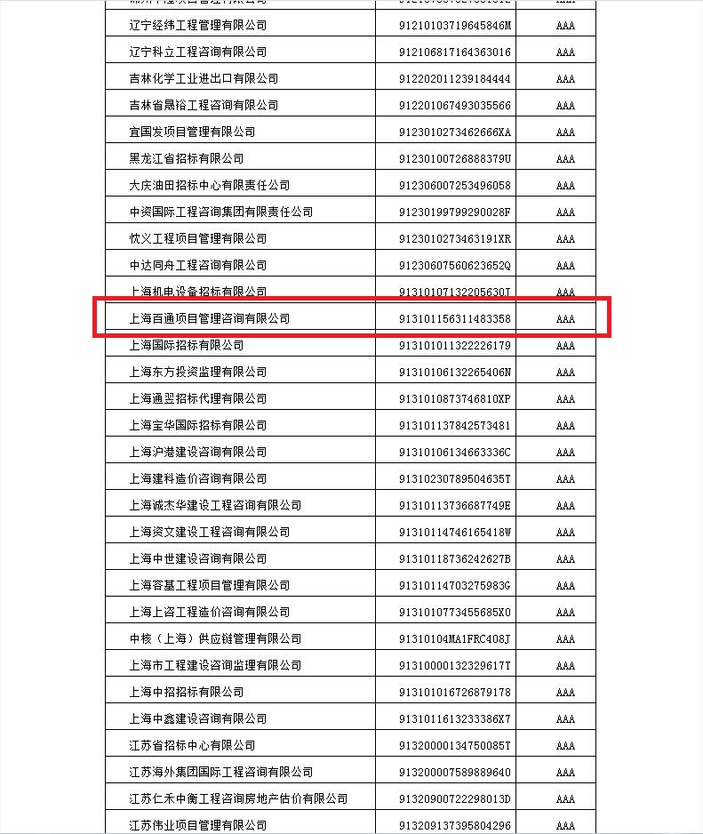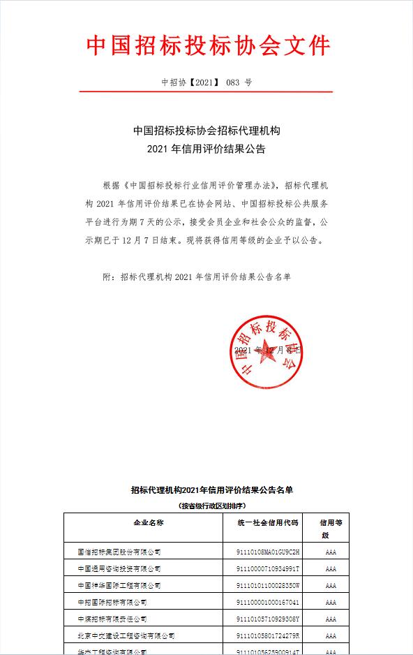 近日,根據(jù)《中國(guó)招標(biāo)投標(biāo)行業(yè)信用評(píng)價(jià)管理辦法》,我司獲評(píng)中國(guó)招標(biāo)投標(biāo)協(xié)會(huì)招標(biāo)代理機(jī)構(gòu)2021年信用評(píng)價(jià)等級(jí)AAA級(jí)。