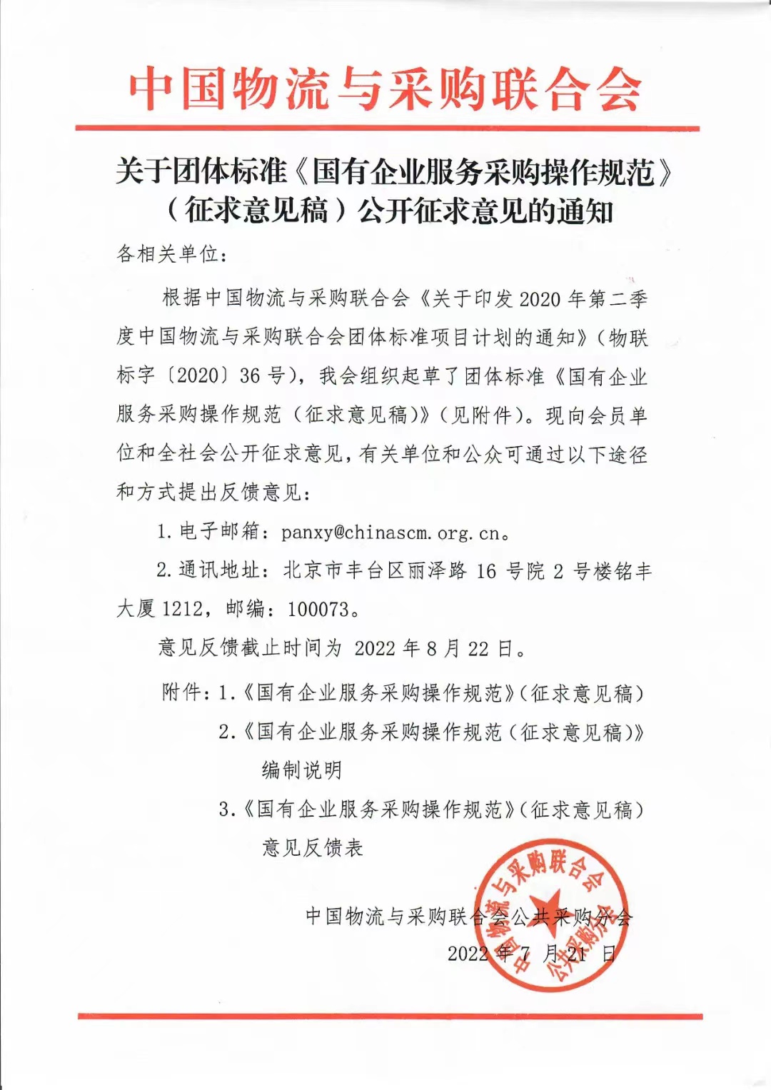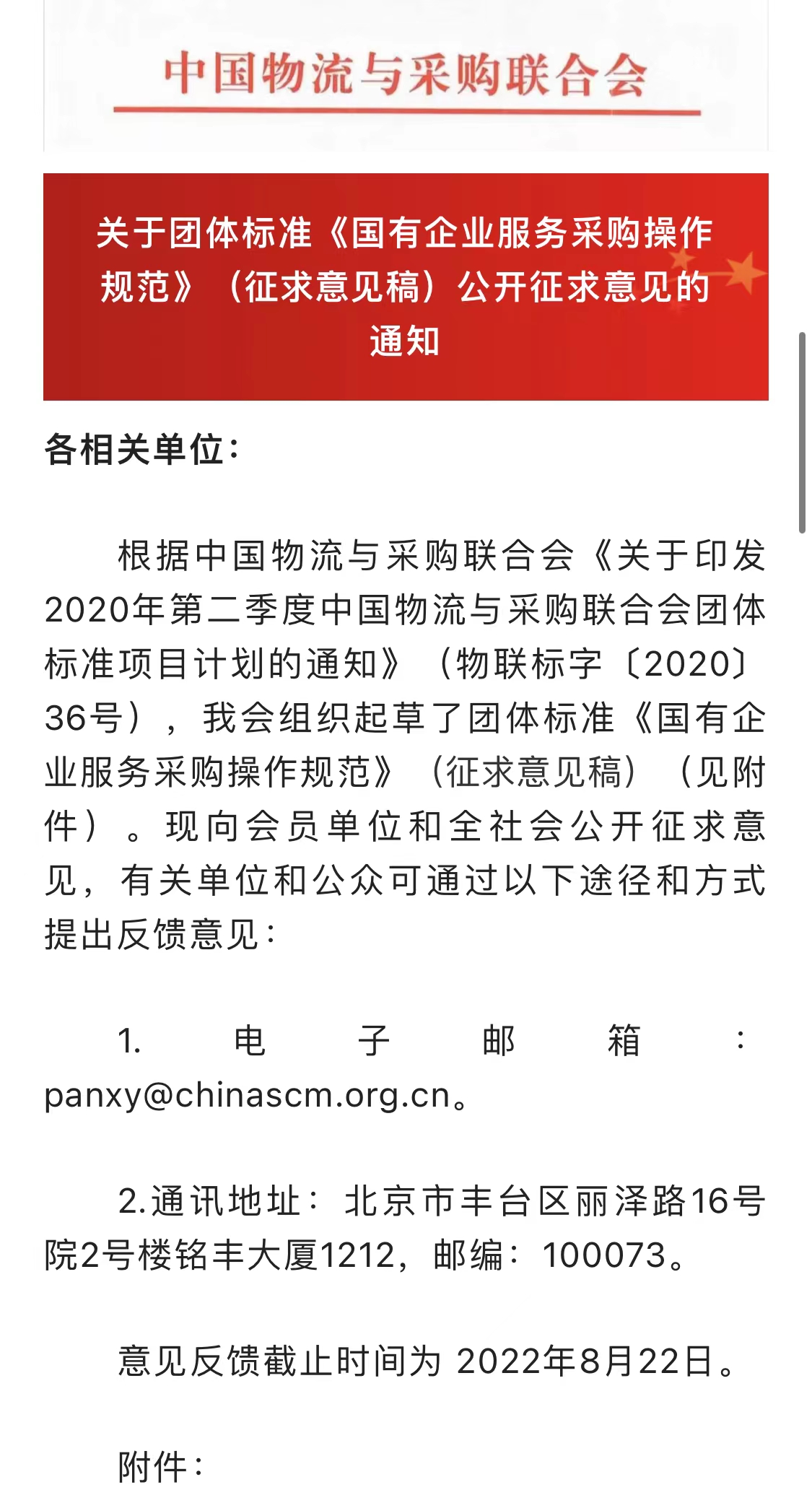 | 我司作為主要起草單位的中國物流與采購聯(lián)合會(huì)團(tuán)體標(biāo)準(zhǔn)《國有企業(yè)服務(wù)采購操作規(guī)范》正式對(duì)全社會(huì)公開征求意見 |