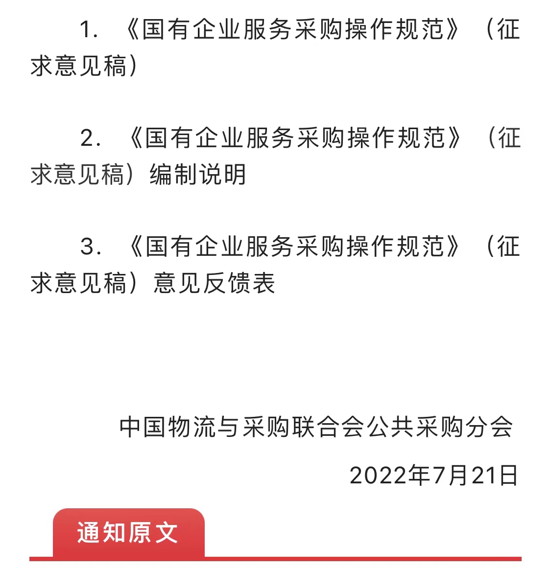 由我司作為主要起草單位的中國物流與采購聯(lián)合會(huì)團(tuán)體標(biāo)準(zhǔn)《國有企業(yè)服務(wù)采購操作規(guī)范》于7月23日正式對(duì)全社會(huì)公開征求意見。