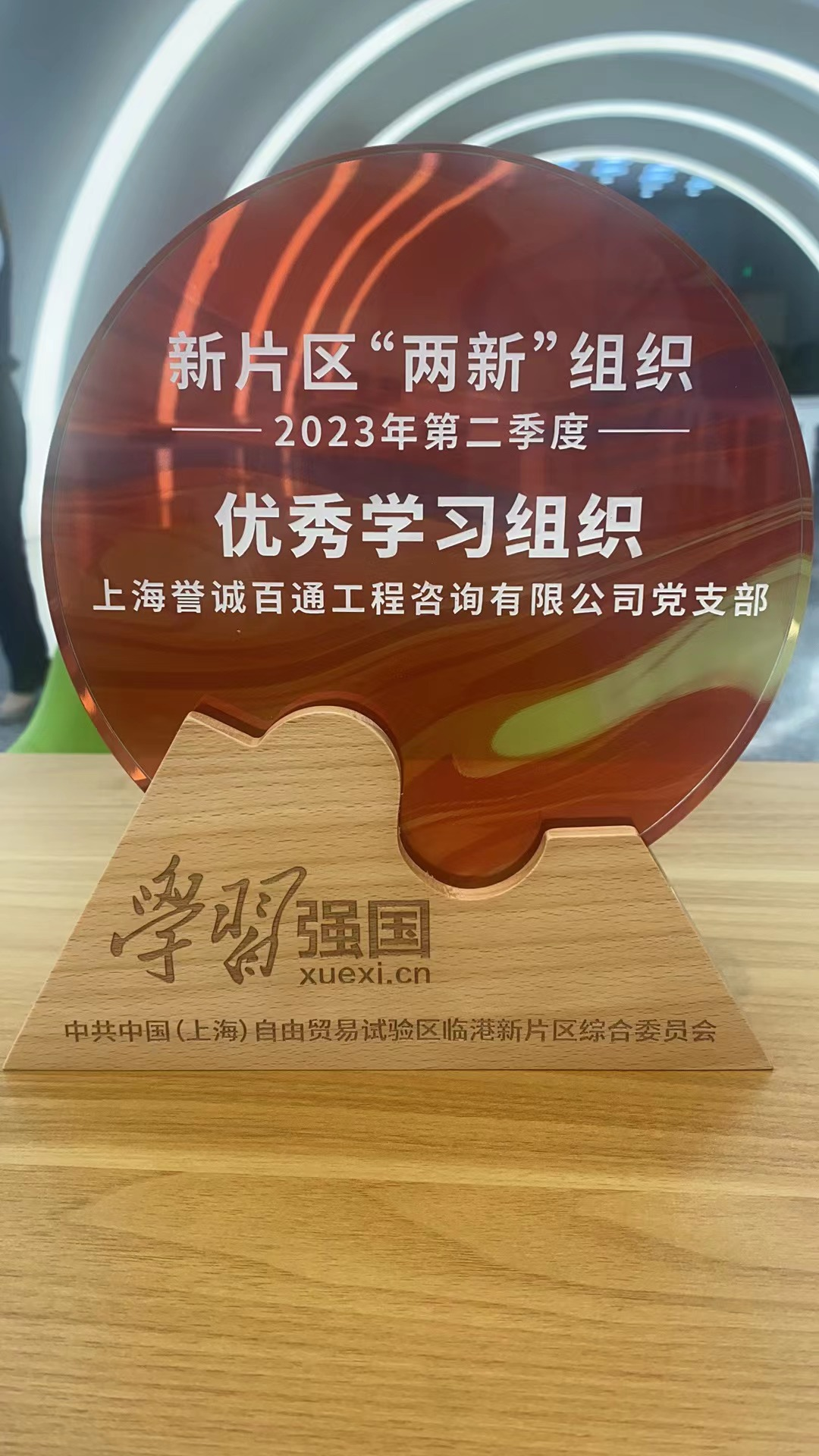 為深入學(xué)習(xí)貫徹習(xí)近平新時代中國特色社會主義思想教育,扎實(shí)推進(jìn)“兩新”黨組織黨建工作,8月2日,臨港新片區(qū)綜合黨委在臨港中心召開了2023半年度新片區(qū)“兩新”組織黨建工作會議。會上,我司子公司上海譽(yù)誠百通工程咨詢有限公司黨支部榮獲新片區(qū)“兩新”組織2023年第二季度學(xué)習(xí)強(qiáng)國“優(yōu)秀學(xué)習(xí)組織”榮譽(yù)稱號。