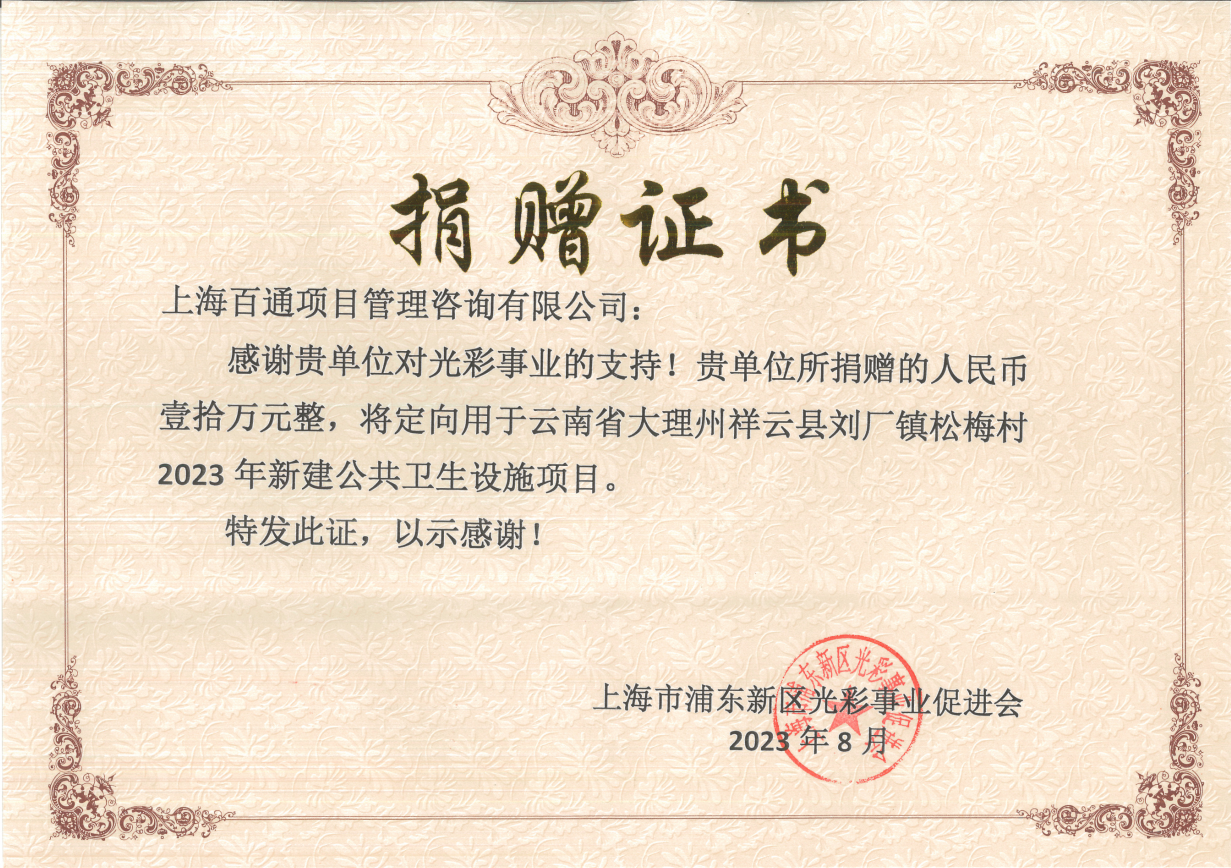 近期,我司積極參與浦東新區(qū)東西部協(xié)作對(duì)口幫扶云南大理、怒江工作,定向捐助10萬元,用于云南省大理州祥云縣劉廠鎮(zhèn)松梅村2023年新建公共衛(wèi)生設(shè)施項(xiàng)目。
