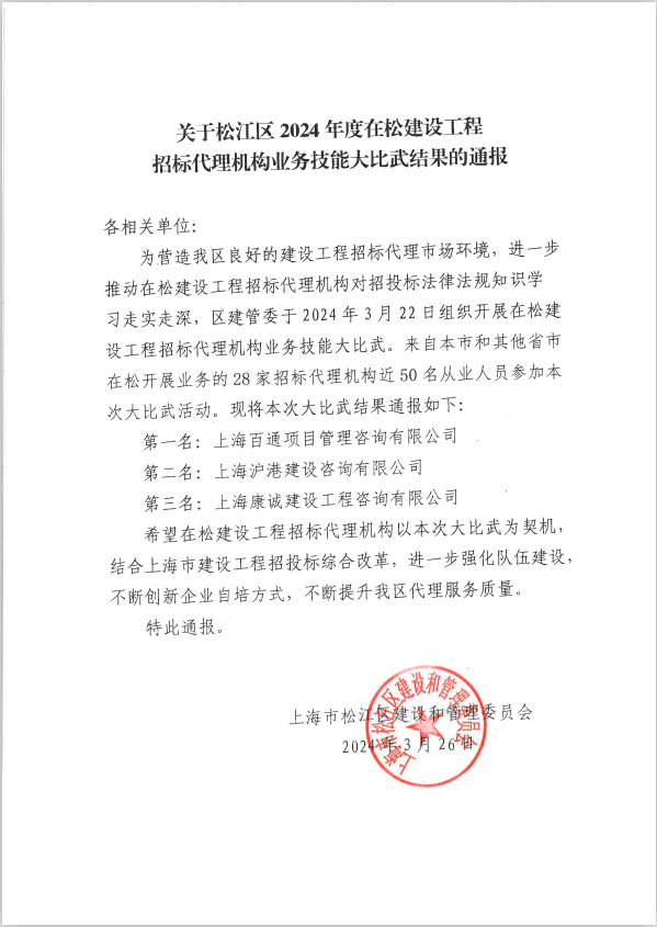 2024年3月22日,招標(biāo)代理板塊參加了由松江區(qū)建管委組織的2024年度在松建設(shè)工程招標(biāo)代理機(jī)構(gòu)業(yè)務(wù)技能大比武。浦西分部經(jīng)理陳佳燕帶領(lǐng)部門員工朱俊龍聯(lián)合咨詢五部張然組成團(tuán)隊(duì)代表公司參戰(zhàn)。經(jīng)過激烈的角逐,最終我司團(tuán)隊(duì)在參加比武的28家招標(biāo)代理機(jī)構(gòu)近50名從業(yè)人員中獲得了第一名的喜人成績(jī)。這是我司繼2019年度取得松江建設(shè)工程招標(biāo)代理業(yè)務(wù)大比武第一名榮譽(yù)后,再次奪得此項(xiàng)殊榮。