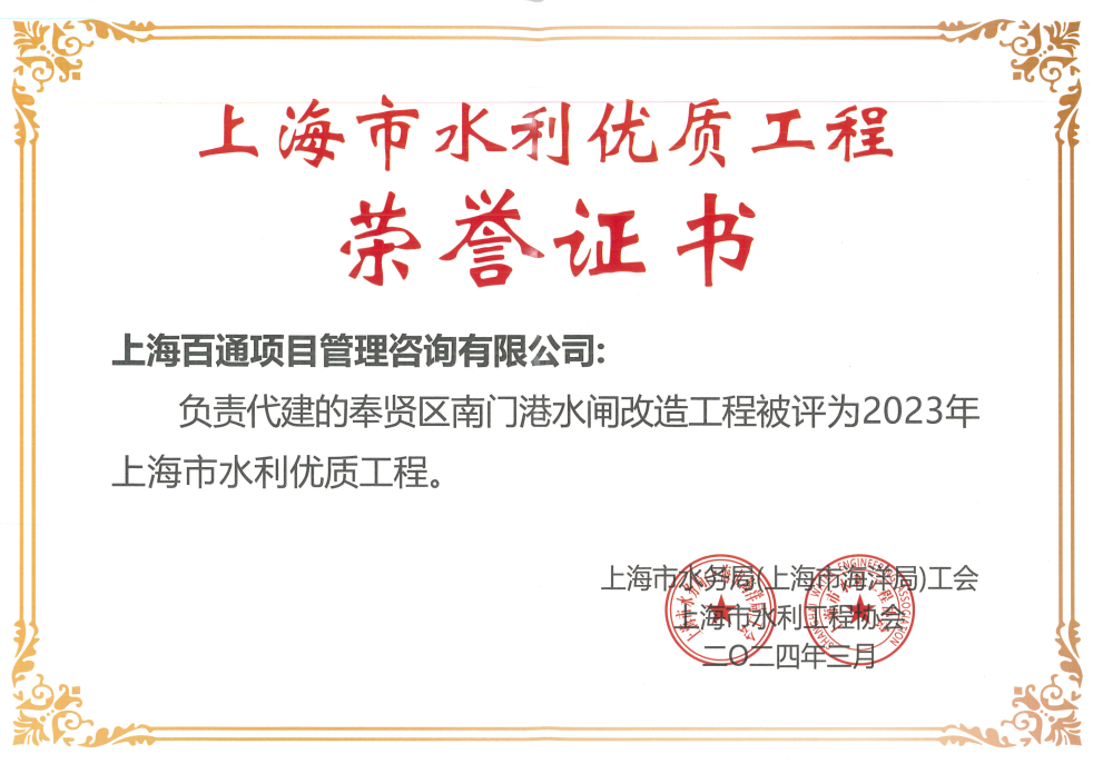 近日,我司收到上海市水務(wù)局(上海市海洋局)工會(huì)及上海市水利工程協(xié)會(huì)頒發(fā)的上海市水利優(yōu)質(zhì)工程榮譽(yù)證書,表彰我司代建的奉賢區(qū)南門港水閘改造工程被評(píng)為“2023年上海市水利優(yōu)質(zhì)工程”。