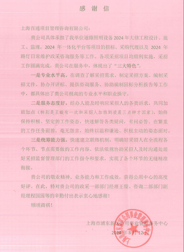 五、先進典型人物 “質(zhì)量月”活動期間涌現(xiàn)了一批先進典型人物,在高質(zhì)量發(fā)展中發(fā)揮了中堅帶頭作用。如近日,我司獲上海市浦東新區(qū)公用事業(yè)管理事務(wù)中心致函感謝,盛贊我司在道路照明設(shè)備大修、2024年一體化平臺項目招標及采購代理、路燈日常維修咨詢服務(wù)中的卓越表現(xiàn)。感謝信特別肯定了我司在專業(yè)水平、服務(wù)態(tài)度與統(tǒng)籌能力方面的杰出貢獻,并對招標代理板塊王璇經(jīng)理及咨詢二部程園園副經(jīng)理的辛勤付出表示衷心感謝。