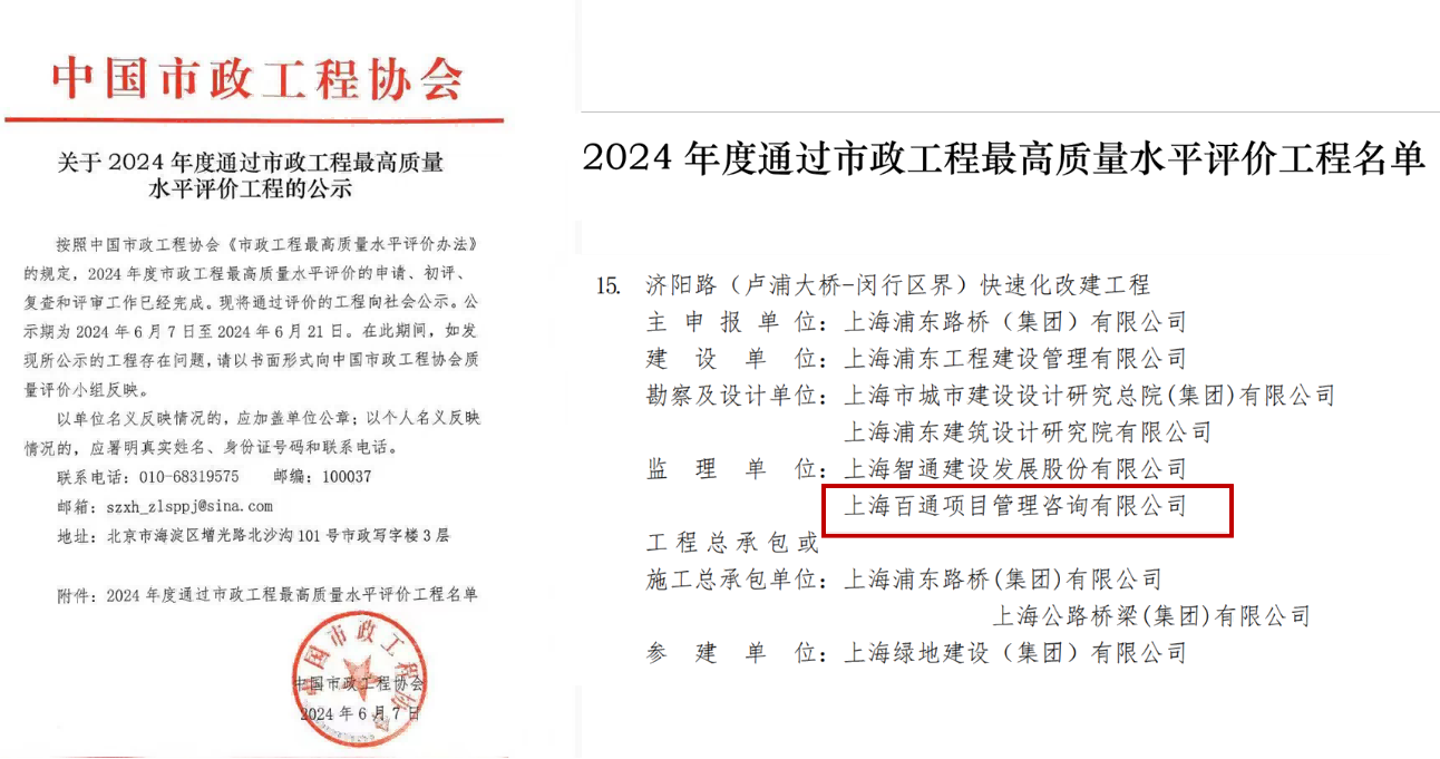 中國市政工程協(xié)會發(fā)布了2024年度市政工程最高質(zhì)量水平評價工程,我司監(jiān)理的濟陽路快速化改建工程項目赫然在列。濟陽路(盧浦大橋至閔行區(qū)界)快速化改建工程因地制宜,融合了既有橋梁拼寬、頂升改造、拆除重建及新建等多種結(jié)構(gòu)形式,堪稱橋梁工程的“博物館”。項目全面采用BIM技術(shù),采用多項新技術(shù)克服建造難題。