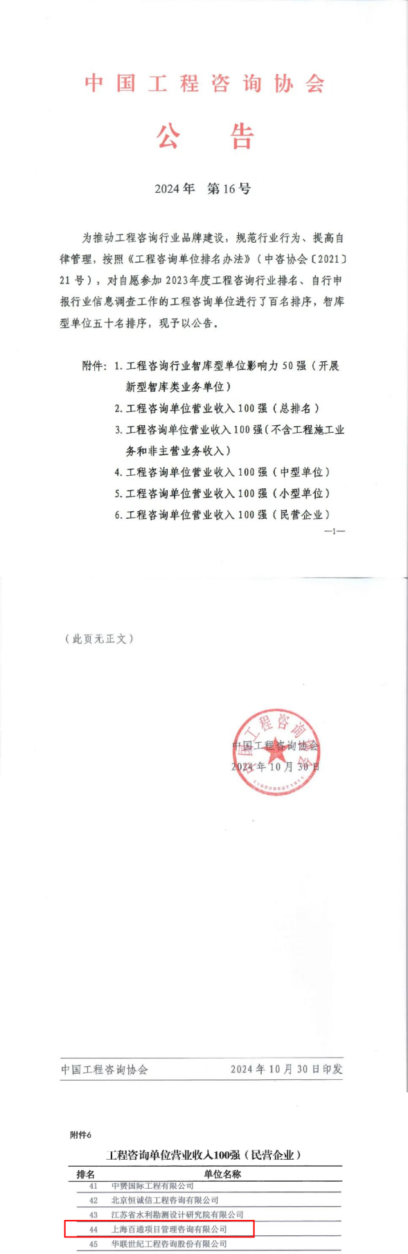 為推動工程咨詢行業(yè)品牌建設,規(guī)范行業(yè)行為,提高自律管理,按照《工程咨詢單位排名辦法》(中咨協(xié)會〔2021〕21號),中國工程咨詢協(xié)會對自愿參加2023年度工程咨詢行業(yè)排名、自行申報行業(yè)信息調(diào)查工作的工程咨詢單位進行了智庫型單位影響力50強和營業(yè)收入100強排序,并發(fā)布了2023年度工程咨詢單位行業(yè)排名名單(中國工程咨詢協(xié)會公告2024年第16號)。 在此次權威排名中,我司憑借卓越的專業(yè)實力、豐富的項目經(jīng)驗和優(yōu)質(zhì)的服務質(zhì)量,成功入圍2023年工程咨詢單位全國民營企業(yè)營業(yè)收入百強,并榮列第44位。這一榮譽不僅是對我司長期以來在工程咨詢領域辛勤耕耘和不懈努力的肯定,更是對我司深厚底蘊和廣泛影響力的有力證明。 展望未來,我司將繼續(xù)發(fā)揮自身優(yōu)勢,不斷突破創(chuàng)新,以更加輝煌的業(yè)績回饋社會,為工程咨詢行業(yè)的繁榮發(fā)展貢獻自己的力量。 詳情請參閱:https://www.cnaec.com.cn/news/11612.html