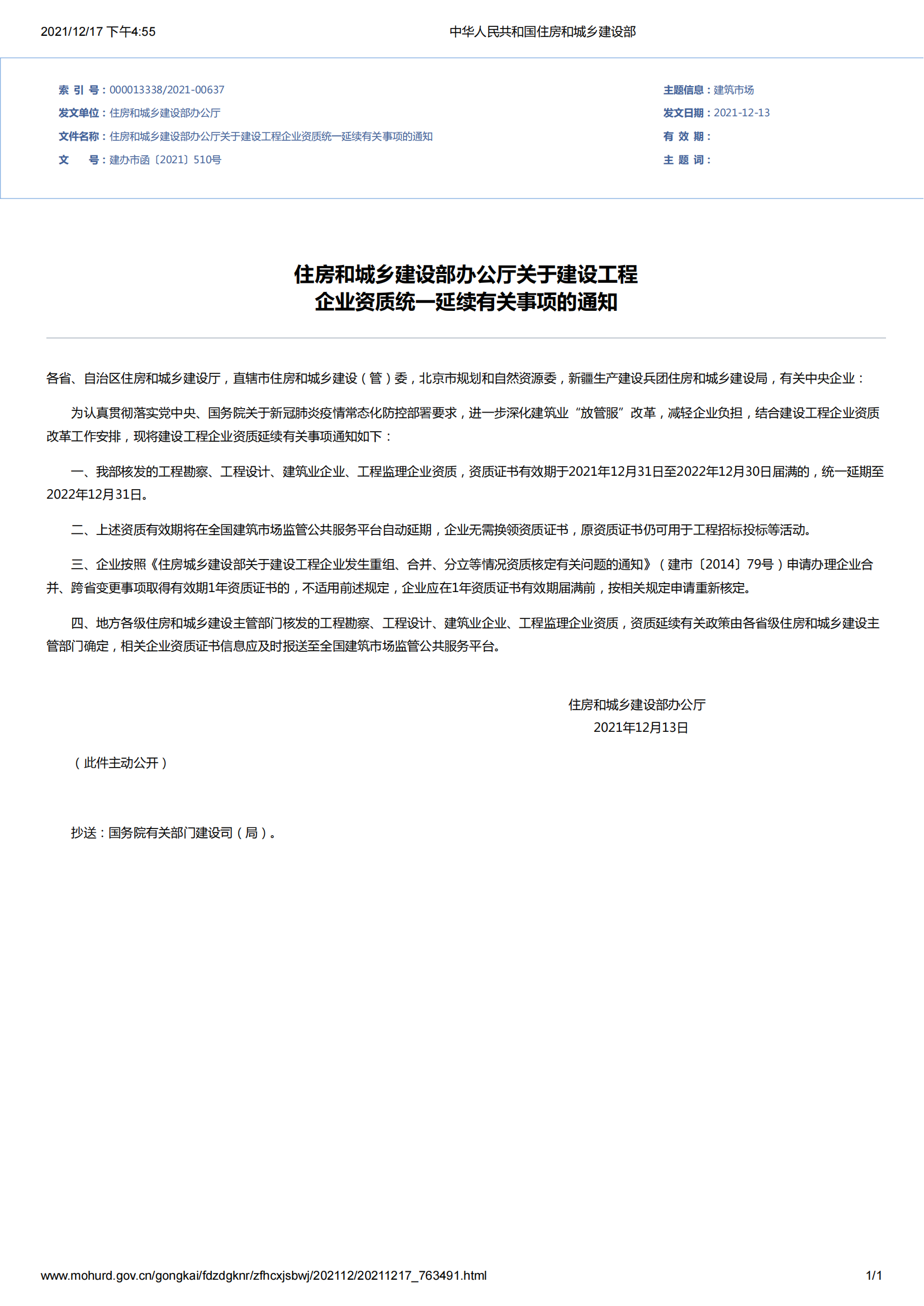 《住房和城鄉(xiāng)建設(shè)部辦公廳關(guān)于建設(shè)工程企業(yè)資質(zhì)統(tǒng)一延續(xù)有關(guān)事項的通知》建辦市函〔2021〕510號